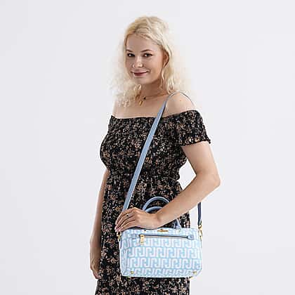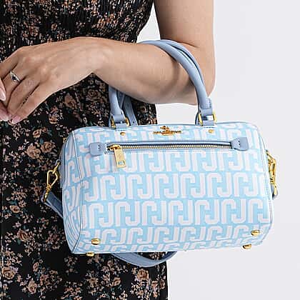 Step out in style with this JVC-Style logo print elegant sling bag in blue. Designed to blend modern charm with everyday practicality, its distinctive logo print and soft blue tone make it an instant favourite. Made from durable PVC with a smooth polyester lining, the bag offers structured form and long-lasting use. The spacious interior, fitted with zipped and slip pockets, keeps your essentials organised wherever you go. Finished with gold-tone detailing, a detachable strap and sturdy top handles, this piece easily transitions from daywear to evening elegance.