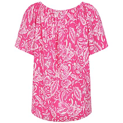 Refresh your wardrobe with the Emreco short sleeve off-shoulder top in a playful white leaf print on pink background. Made from 100% viscose, this piece is breathable, lightweight, and requires minimal upkeep—perfect for laid-back days or holidays away. The gathered neckline gives you two styling choices, either worn off the shoulder for a chic edge or as a classic scoop for everyday ease. A gently curved hemline completes the relaxed silhouette, offering both shape and comfort. The pink leaf design lends a soft yet vibrant character, making it a versatile option to wear with denim or smarter separates.
