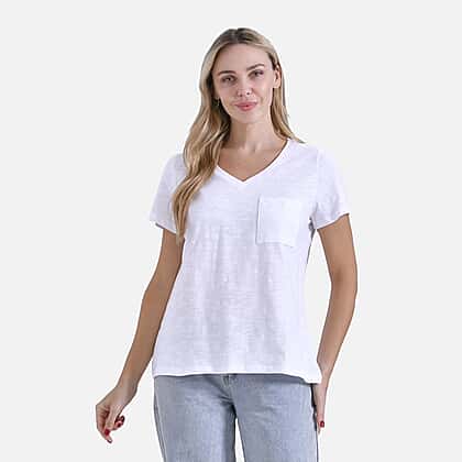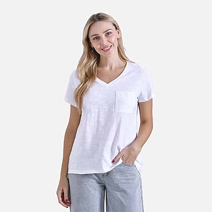 La Marey’s white cotton V-neck top is a wardrobe classic, reinvented for maximum comfort. Its soft cotton feel and easy cut make it ideal for layering or wearing on its own during warm days. The short sleeves and chest pocket offer relaxed styling, while the flattering V neckline gives it a crisp, clean finish. Perfect for holidays, daily errands or lounging in style.