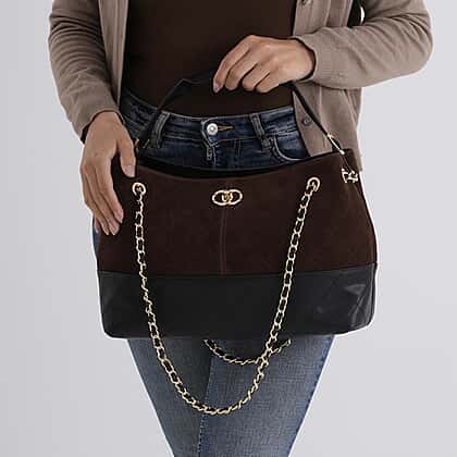Valissiere Designer Inspired Genuine Leather Two-Tone Quilted Shoulder Handbag with Gold Chain Strap - Coffee