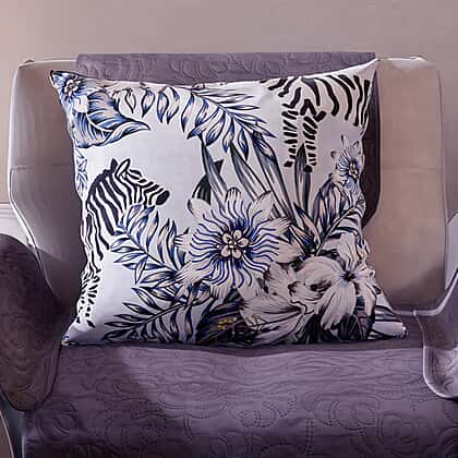 TJC Zebra and Floral Pattern Velvet Cushion (Size 43x43 Cm) - Blue