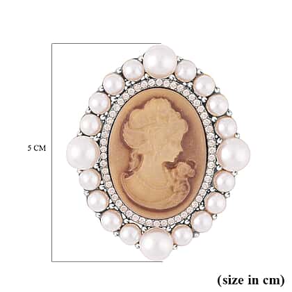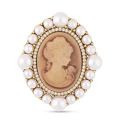 Cameo, White Austrian Crystal and Simulated Pearl Brooch in Yellow Gold Tone