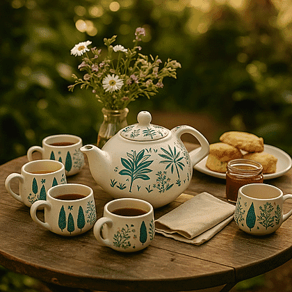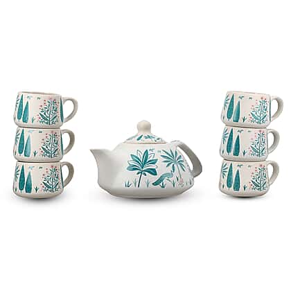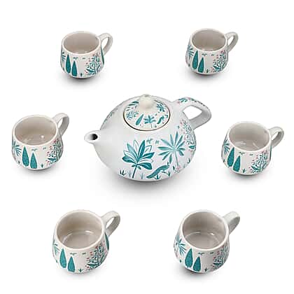 7-Piece Hand-Painted Ceramic Set - 1 Tea-Coffee Pot & 6 Cups in Display Box - Green