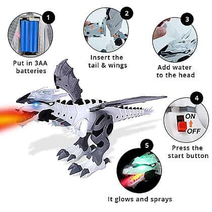 - FEATURES: The dragon toy will demonstrate its excellent walking action, loud roaring, and spraying, and the addition of an LED light makes it much more amazing to play in a darkened space