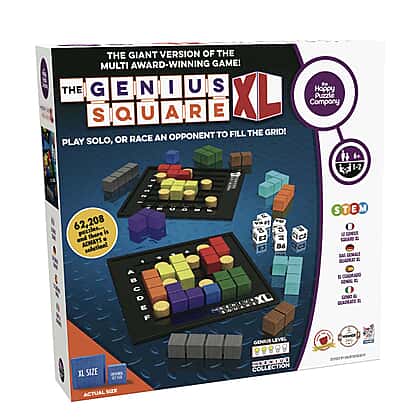 Challenge your mind with The Genius Square XL, the giant version of the award-winning puzzle game! Perfect for solo play or a fun competition between two players, the objective is to fill the grid using nine coloured shapes around seven blockers. With an incredible 62,208 possible puzzles, this game offers endless hours of brain-teasing fun. Designed for players aged 6 and up, it develops skills like spatial awareness, strategic planning, sequencing, and visual perception. Whether you're solving puzzles alone or racing a friend, there's always a solution waiting to be discovered!
