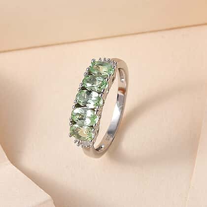 Make a statement with this stunning Tsavorite garnet 5-stone ring, as this beauty is designed just for you. Laced with tapered baguettes of sparkling diamonds, the gorgeous ring features 1.26 ct. oval-shaped garnet gemstones to create a timeless and elegant design. The platinum overlay adds an extra layer of luxury to the already exquisite ring, while the sterling silver ensures durability and comfort for everyday wear. This ring is perfect for those who want to stand out and add colour to their style.