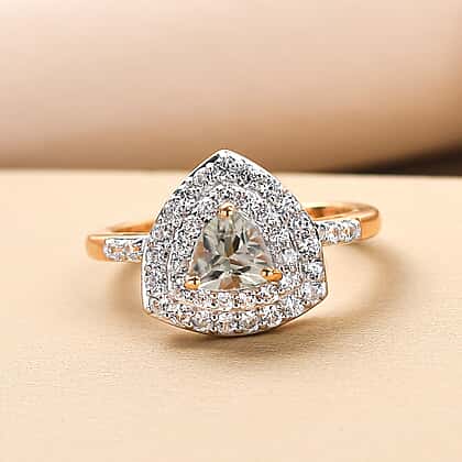 This exquisite ring comes with the Turkizite zircon as the centre stone embedded through a three-prong setting surrounded by white zircon, and shoulder of the ring is also embedded with zircon which adds to the style. It is made in vermeil yellow gold plated sterling silver to add a classic appeal. The metal weighs 2.600 making it incredibly lightweight to wear comfortably for long hours.