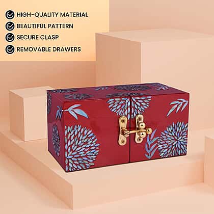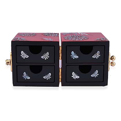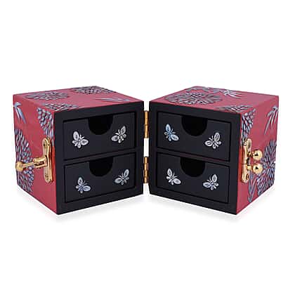 Twin Cube Jewellery Box Organiser Hand Made Mother of Pearl Sea Shell Inlay Lacquered Floral Chrysanthemum Pattern- Red