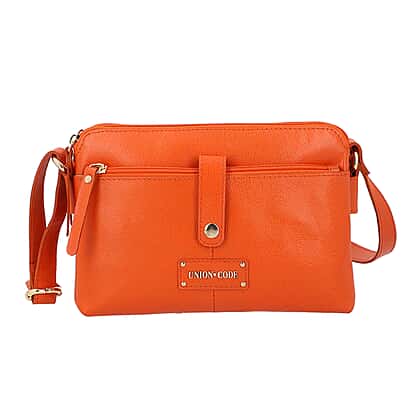UNION CODE Super Soft 100% Genuine Leather Multi Pocket Crossbody Sling Bag with Zipper Closure (Size 25.5x3x18 Cm) - Orange