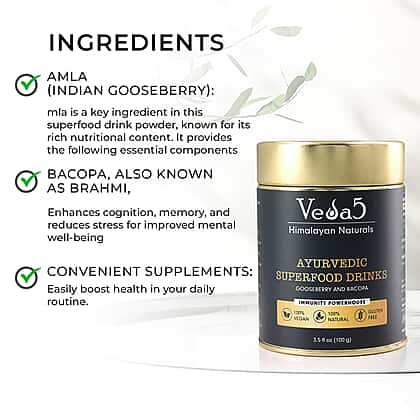 Nourish your well-being with Veda 5's Amla & Brahmi Supplements. Each 100g sachet is a fusion of Amla's antioxidant prowess and Brahmi's mind-sharpening essence. Ideal for those seeking a natural boost, this supplement supports your immune system while enhancing cognitive agility. It's your daily dose of wellness, crafted for clarity and vitality. Trust in the power of Veda 5 to harmonise your health with the purest ingredients for your mindful lifestyle.