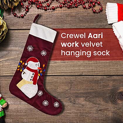 Make your wall look more colourful and trendy with this crewel aari work velvet hanging socks. This sock is made from very fine and delicate fabric with a detailed design on it and features pom-pom lace detailing around the edges to give a new look. You can hang this sock where ever you want with a loop on one side and has a slide-in pocket to store candies or gifts.