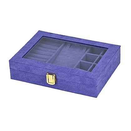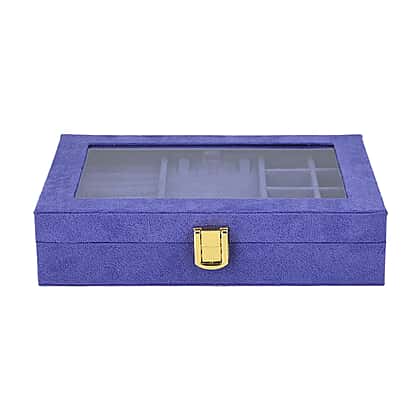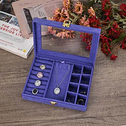 Velvet Jewellery Box With Transparent Window - Features 8 ring slots, 8 small sections, and a removable necklace tray - Tanzanite Blue