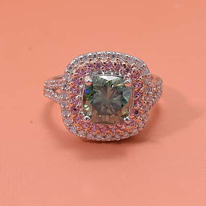 Vibrant Green Moissanite and Pink Sapphire Ring in Rhodium Overlay Sterling Silver - 3.25ct