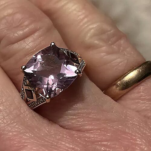 Beautiful in every way. A pale pink/purple colour set a well made smooth rose gold colour shank. Good depth to the stone & held in by smooth substantial claws. Sits against another ring great. Wrapped well & posted promptly. |