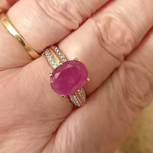 Beautiful ring, the stones are a Beverly vivid pink colour and the little diamond sparkles. Looks beautiful stacked with other band rings too |