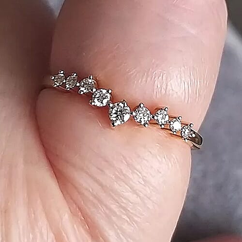 Such a pretty ring- lab grown chevron. It's sparkly, but still is elegant and discreet. I can wear on middle fingers and thumbs, depending what other rings I'm wearing. Very happy with my purchase. Highly recommended. |
