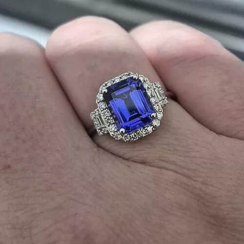 Stunning ring with beautiful tanzanite. The colour is exquizite and the diamonds are bright and sparkly too. This is a very wearable size of ring and not too high, which some rings can be for me. I have big hands and need a substantial size of ring to have an impact. I was impressed by the price of this ring too. . . . I love my new tanzanite! |