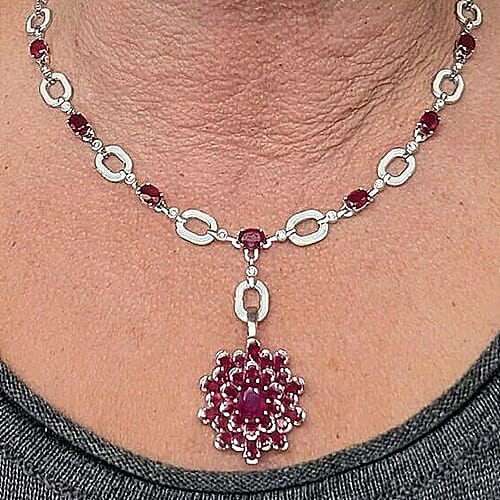 This necklace is a true statement piece. When it was presented on TV no mention was made that the sterling silver links had white enamel on them. Quite honestly, when I first saw it, I didn't know what to think. But then I tried it on and WOW! It is stunning. It is a heavy piece and it lays perfectly around your neck. No adjusting because it never moves. It has a very substantial fastener like the ones you see on bracelets. The rubies go all the way around your neck. Love, love, love this necklace! |