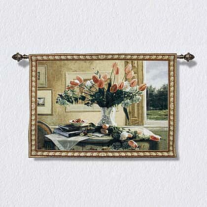 • THEME: This wall tapestry features a bouquet of blush-coloured tulips that are brilliantly arranged in an oriental-style vase