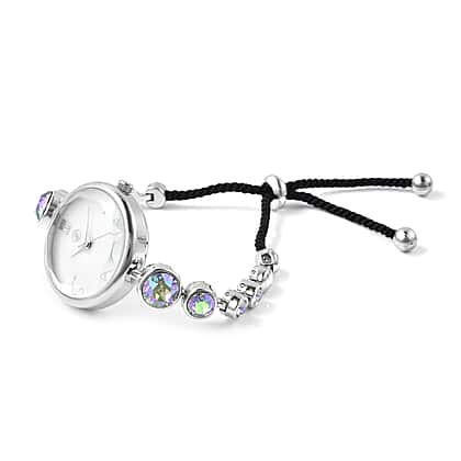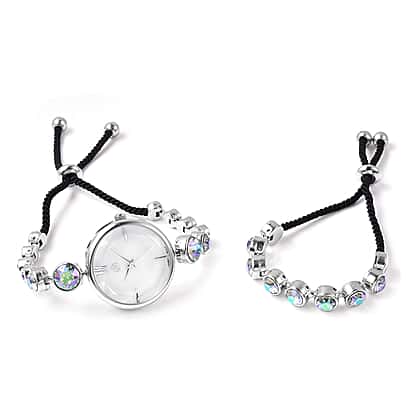 2 Piece Set - GENOA Japanese Movement Magic Colour Crystal Studded Water Resistant Bracelet Watch and Adjustable Bolo Bracelet (Size 6-9.5) in Silver Tone