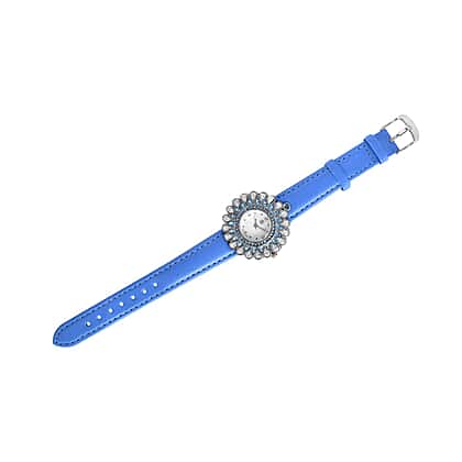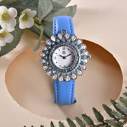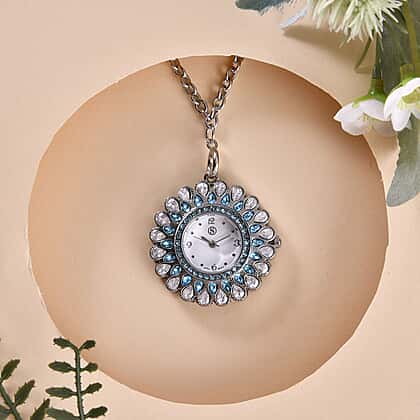 2 Piece Set - STRADA Japanese Movement Floral Design Water Resistant Watch with Blue Colour Strap and Pendant with Chain