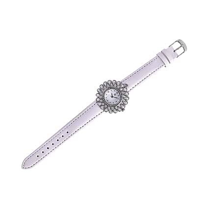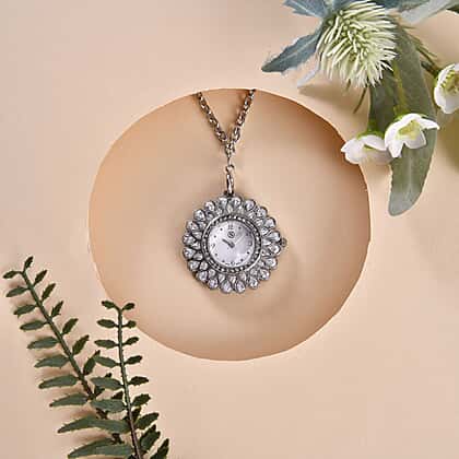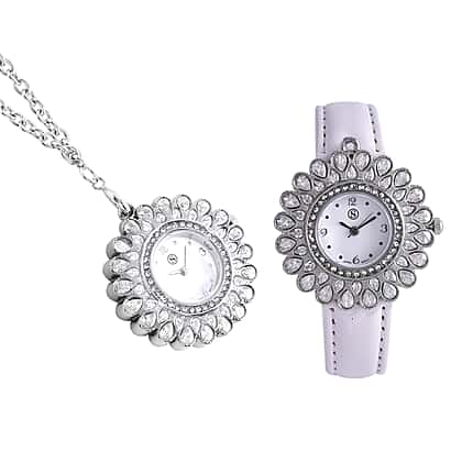 2 Piece Set - STRADA Japanese Movement Floral Design Water Resistant Watch with White Colour Strap and Pendant with Chain (Size 28)