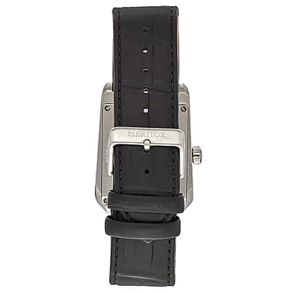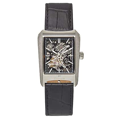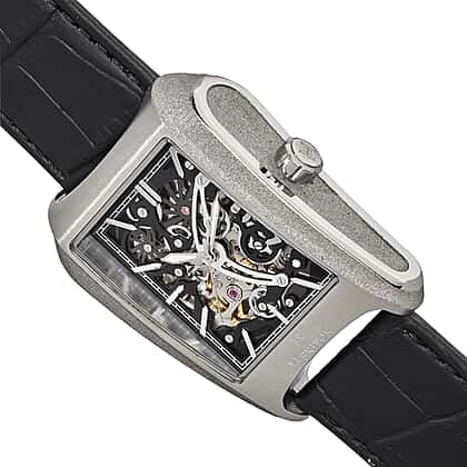 The Heritor Automatic Wyatt Skeleton Watch, in an elegant silver and black combination, exudes sophistication and mechanical finesse. Crafted with a 316L surgical-quality stainless steel case, this timepiece showcases a stunning skeleton dial through sapphire-coated mineral crystal. The jewelled automatic movement, comprising 21 jewels with a 42-hour power reserve, ticks at a precise 21600 beats per hour. Its observation case-back reveals the intricate movement, while the genuine leather crocodile-embossed strap and logo-engraved stainless steel clasp add a touch of luxury.