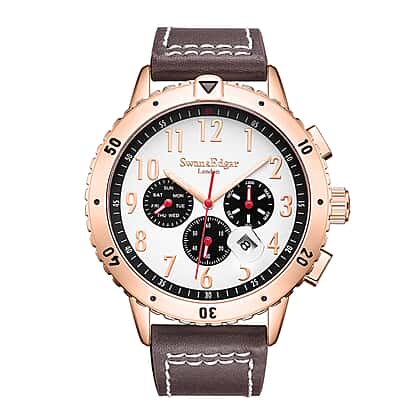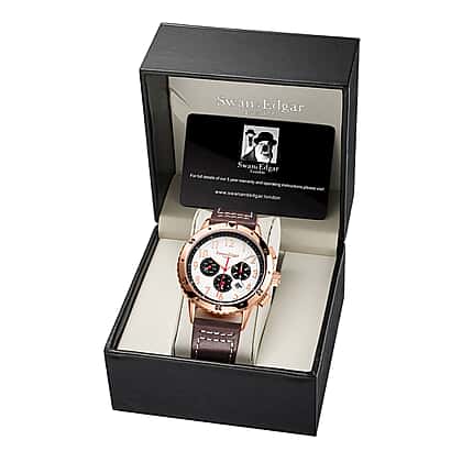 Explore your wild side with this Limited Edition Swan & Edgar Hand Assembled Discern Watch with Brown Leather Strap. The watch crafted in stainless steel sits boldly on your wrist with a brown leather strap. The rose gold finish appeals to your aesthetic side while the white dial radiates pure joy with numerals laid out along its round circumference. The chronograph look adds to the rugged charm of the timepiece.