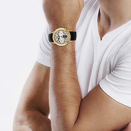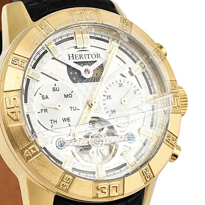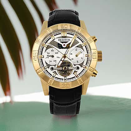 Marvel at the mechanics of time with the Heritor Hannibal watch, featuring a semi-skeleton dial that reveals the intricate dance of gears beneath. Encased in a striking gold tone and complemented by a luxurious black leather strap, this watch combines classic elegance with modern functionality. With 5 ATM water resistance and an automatic movement that winds itself with the motion of your wrist, this timepiece is both a reliable companion for everyday wear and a dazzling addition to your collection.