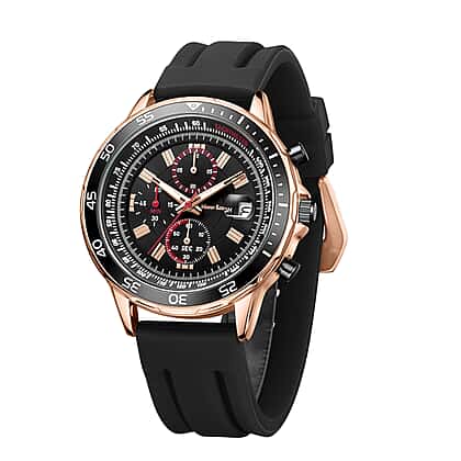 - Black strap contrasted by a rose gold IP case lends it a contemporary finish