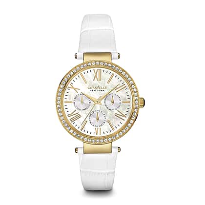 CARAVELLE Gold Tone Dial Ladies Watch with White Leather Strap
