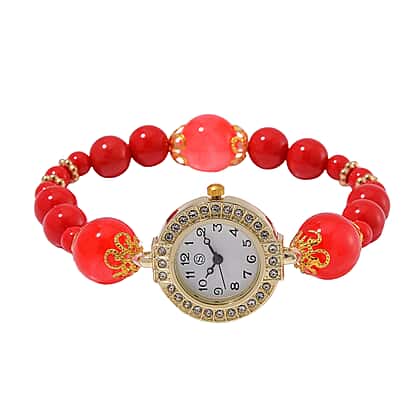 Make a vibrant statement with this 4-Piece Set – STRADA Crystal Watch and Bracelets, designed to combine elegance and functionality. The gold-plated alloy watch case is adorned with sparkling white crystals, perfectly complementing the vivid red resin bead bracelets. Powered by the precise PC21S Japan Movement, the watch features a clean white dial with numeral markers and an elastic strap accented with alloy charms, including a charming starfish. The three matching bracelets, crafted with red resin beads and shimmering crystal details, offer a stylish layered look. This versatile set is ideal for elevating both casual and formal outfits.