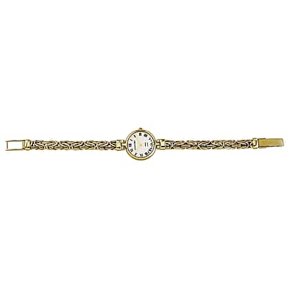 This 9K yellow gold women's watch is exquisitely crafted and marries timeless elegance with Swiss precision. A treasure for your wrist, the byzantine bracelet strap adds a touch of ancient luxury to modern-day sophistication. Powered by a reliable quartz movement, it ensures punctuality is as graceful as your style. Perfect for those who appreciate the finer things in life, this piece is a silent statement of class and reliability.