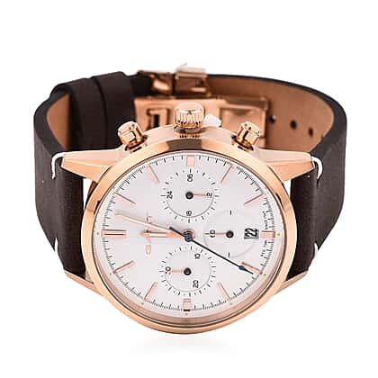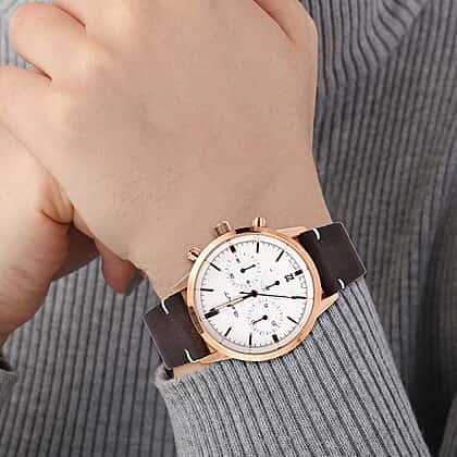 - It has a brown leather strap with a buckle fastening to secure the fit