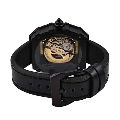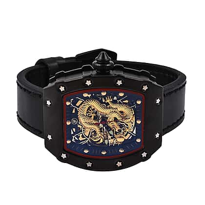 GENOA Automatic Mechanical Movement 3 ATM Water Resistant Watch with Golden Dragon Pattern Dial and Black Leather Strap - Black