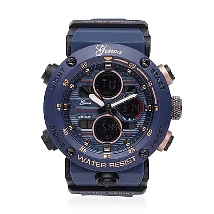 The multi-functionality of this Genoa dual-time watch will add to your chic style and create a contemporary addition to your essential accessory collection. This wristwatch is equipped with a digital and a round stick analogue, allowing you to set both clocks in different time zones. The watch features a week & date, a night light, an alarm clock, and a stopwatch that adds to its usage in your daily life. The premium look of the silicon strap adds to its appearance. It is water resistant and can be an excellent gift for a near and dear one.