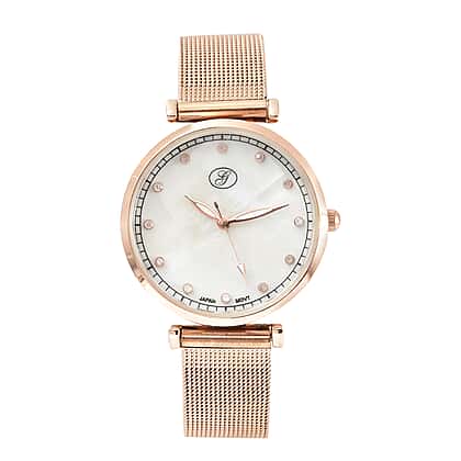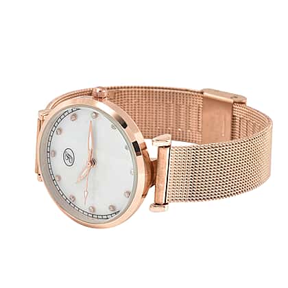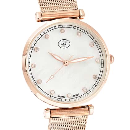 GENOA Japanese Movement White Dial Diamond Studded Water Resistant Watch with Mesh Belt in Rose Gold Tone