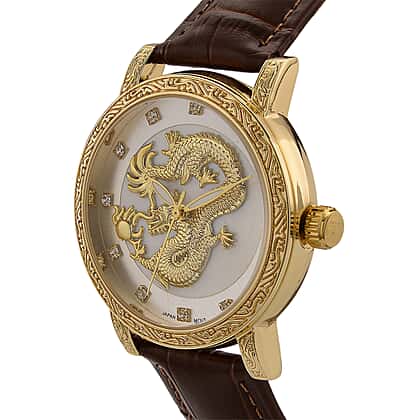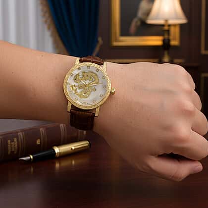 GENOA TIME LIMITED EDITION Dragon Series 3ATM WR Mother Of Pearl Dial & Gold Case Watch with Austrian Crystal Accents & Brown Leather Strap Presented in a Gift Box