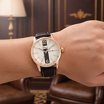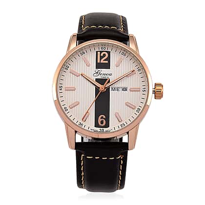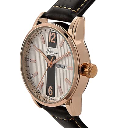 GENOA TIME V2 Double Date Quartz PC33 3ATM WR White Hydraulic Dial & Rose Gold Case Mens Watch with Coffee Leather Strap