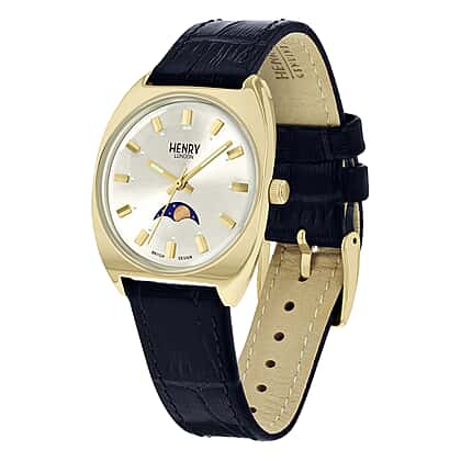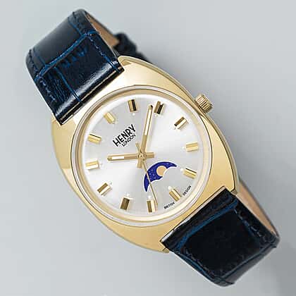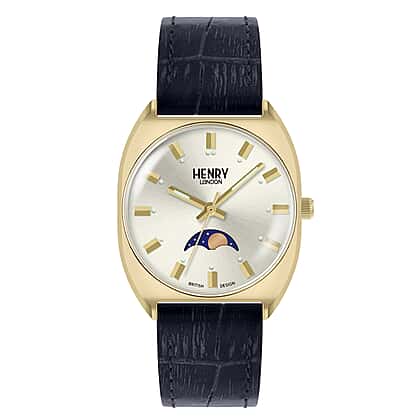 Henry London Moonphase Square Round White Silver Dial 3 ATM Water Resistant Watch with Navy Blue Colour Croc Pattern Strap
