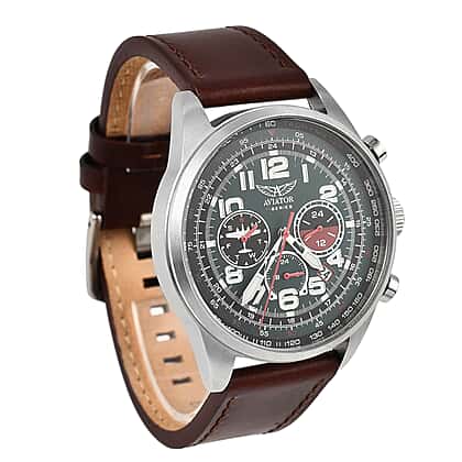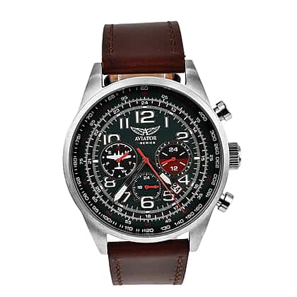 Discover the precision and style of the AVIATOR 5 ATM water resistant men's watch. The watch features a striking green dial encased in a robust 44 mm stainless steel silver case, complemented by a sophisticated brown leather strap. This watch combines functionality with elegance, offering features like a date display, day of the week, 24-hour time, and a tachymeter. It's an ideal accessory for the modern man who values form and function.