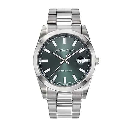 The Mathey Tissot Limited Edition Sunray Quartz Watch is a striking blend of refinement and modern appeal, featuring a 40mm stainless steel case and a captivating green sunray dial. The Ronda 515 quartz movement delivers precision timekeeping, while the Super LumiNova hands and markers ensure excellent readability in any lighting. A scratch-resistant mineral glass protects the dial, and the fixed silver-tone bezel enhances its polished aesthetic. With a 5 ATM water resistance, this timepiece is designed for both style and practicality. Paired with a stainless steel bracelet, it’s the perfect companion for everyday sophistication.