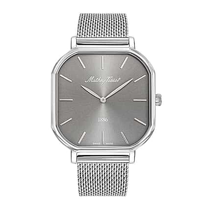 Mathey Tissot Monsoon Square Swiss Movt. 3ATM WR Grey Dial Mens Watch with Silver Colour Stainless Steel Mesh Strap