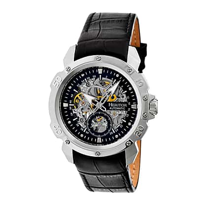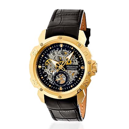Mens Conrad Heritor Automatic Watch with a Black Dial and a Black coloured Leather band, featuring a Gold coloured Stainless Steel case with 5 ATM water resistance