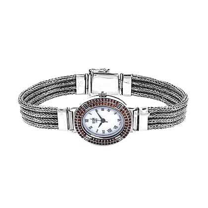 Royal Bali Collection - EON 1962 Swiss Movement Mozambique Garnet Studded Water Resistant Tulang Naga Bracelet Watch (Size 8) in Sterling Silver 1.23 Ct, Silver wt 37.09 Gms