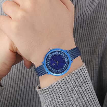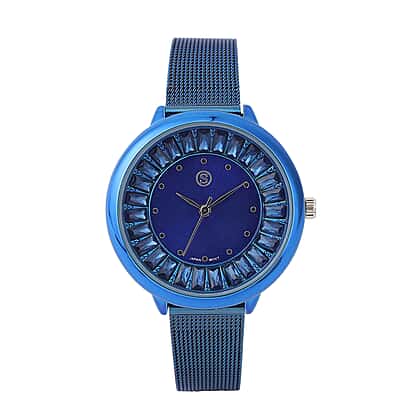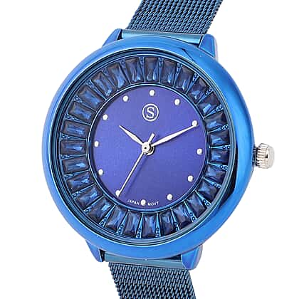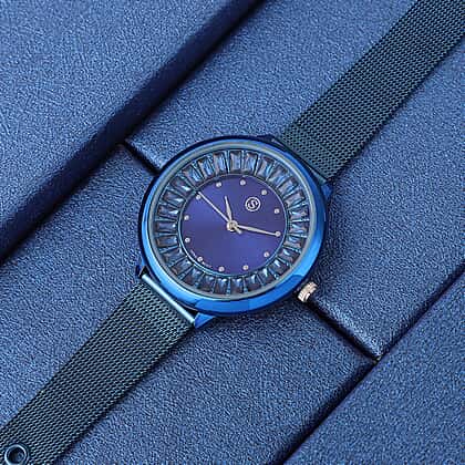STRADA Japanese Movement Blue Dial Simulated Blue Sapphire Studded Water Resistant Watch with Blue Colour Mesh Belt