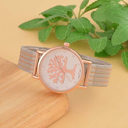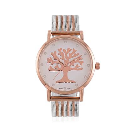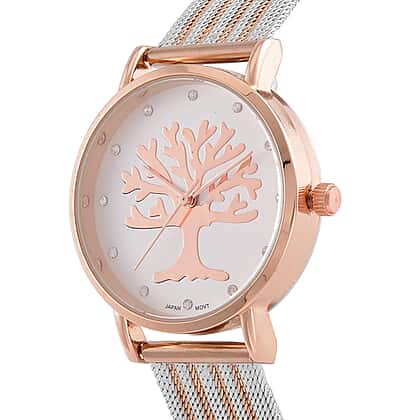 STRADA Japanese Movement Tree Pattern Water Resistant Watch in Rose Gold Tone with Stainless Steel Mesh Strap