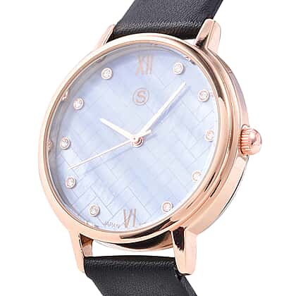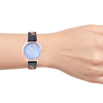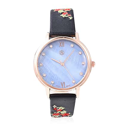 STRADA Japanese Movement White Austrian Crystal Water Resistance Watch with Floral Embroidery on Strap in Black Colour