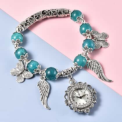 STRADA Japanese Movement White Austrian Crystal Studded Amazonite Beads Stretchable Bracelet (6.5-7) Water Resistant Butterfly & Angel Wing Charm Watch in Silver Tone