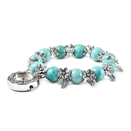 STRADA Japanese Movement White Austrian Crystal and Amazonite Beads Bracelet Watch in Silver Tone